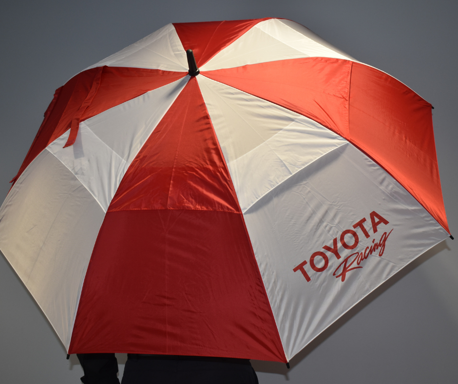 Fabricado con nylon resistente, este accesorio meteorológico cuenta con un arco de 58" con un eje de fibra de vidrio y costillas Duraflex™ para una mayor durabilidad. Cuenta con apertura automática, tecnología ventilada para resistir vientos fuertes, un cómodo mango de goma negra con pulverizador y viene con una funda a juego para un almacenamiento conveniente. El icónico logo de Toyota Racing está impreso en rojo, añadiendo un toque de estilo a este práctico producto.